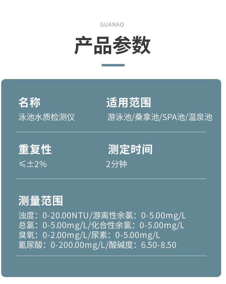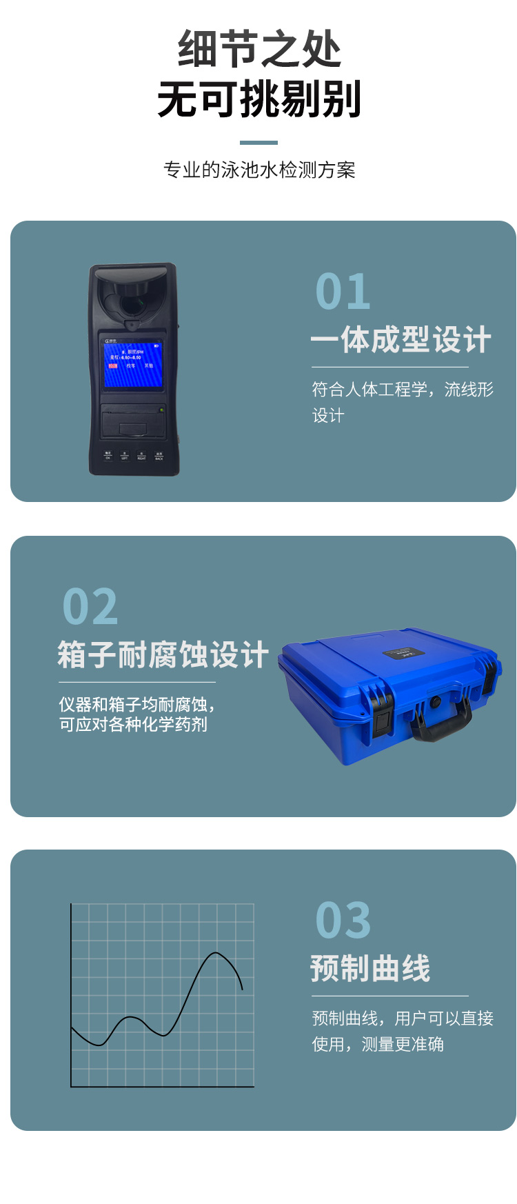 1、相比于傳統的試劑試紙測定,貫奧泳池水質檢測箱的檢測數據更準確,檢測速度更快。