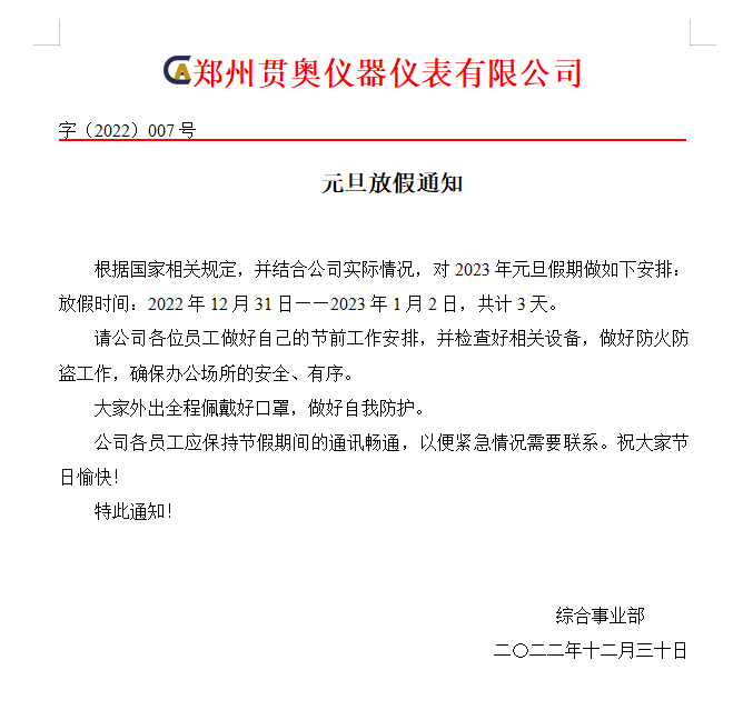 2023年元旦佳節將至,首先向全體員工致以節日的問候,為了大家能度過歡樂、祥和、平安的節日,特提醒全體人員注意以下幾點: